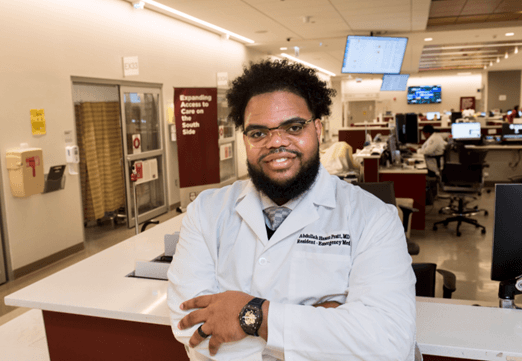 Dr. Abdullah Hasan Pratt is an Assistant Professor and Emergency Medicine Physician at the University of Chicago Medical Center. He is a graduate of the University of Chicago, Pritzker School of Medicine. Known as “Dee,” Dr. Pratt’s goal has always been to have a career advocating for underserved communities and addressing systemic healthcare disparities. His lifetime as a resident of Chicago’s South Side has shaped and guided his career to this point. He attributes this commitment to his childhood experiences witnessing the poor health conditions, premature deaths, and day-to-day struggles from a lack of access to proper healthcare by the people he cared about. This was most evident in the wake of his older brother’s murder secondary to gun violence, where, in coping with the loss, he dedicated his efforts toward mentoring at-risk youth, coaching youth football, and community organizing around violence prevention.
